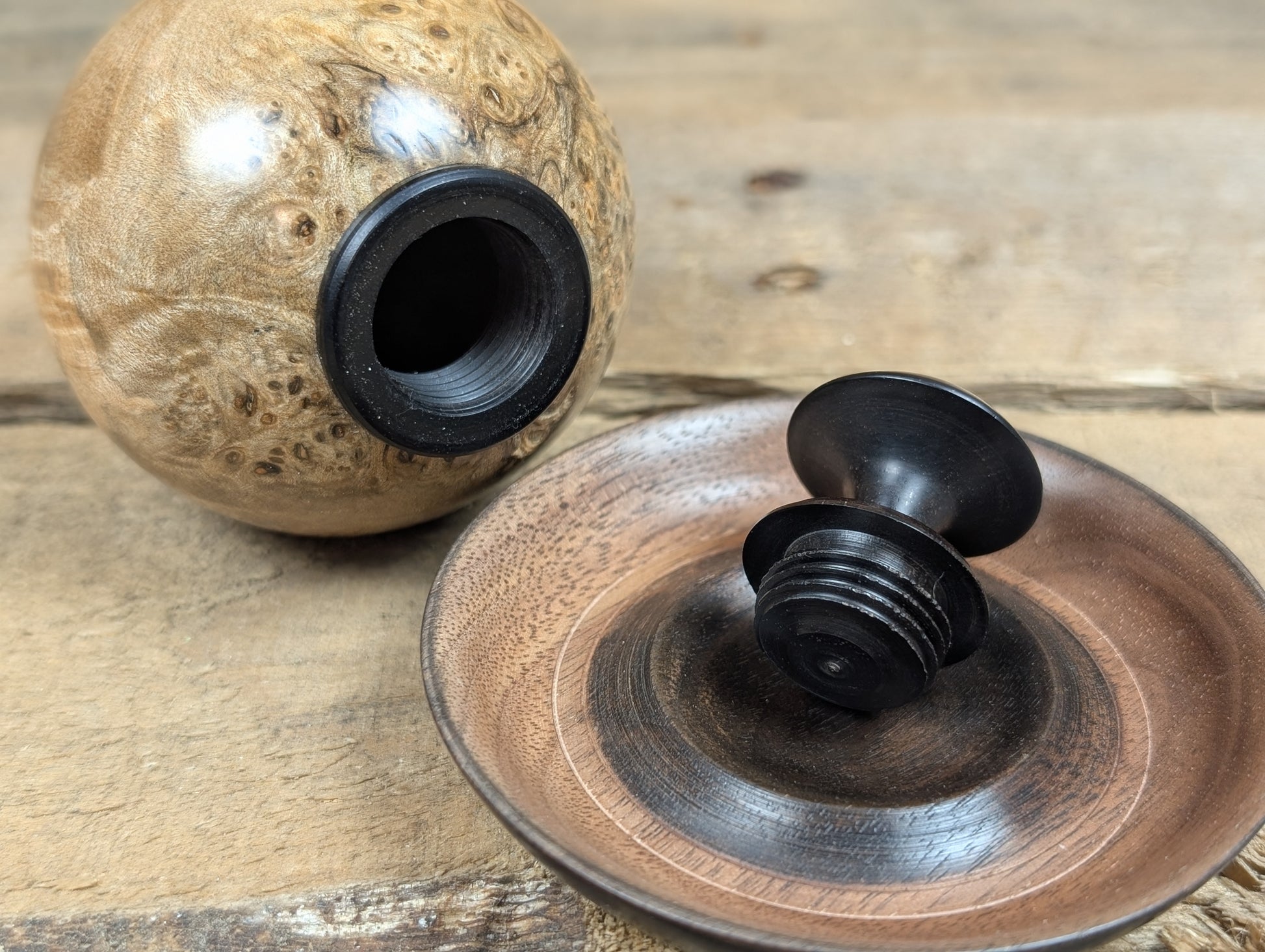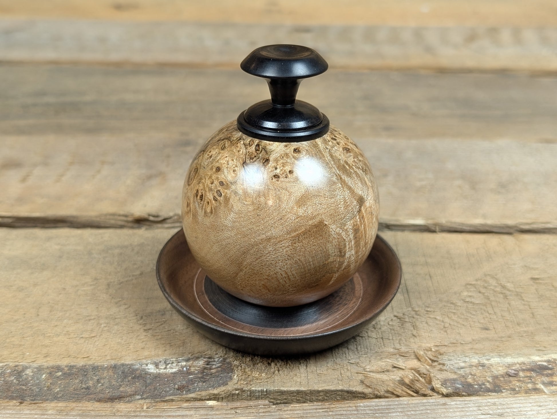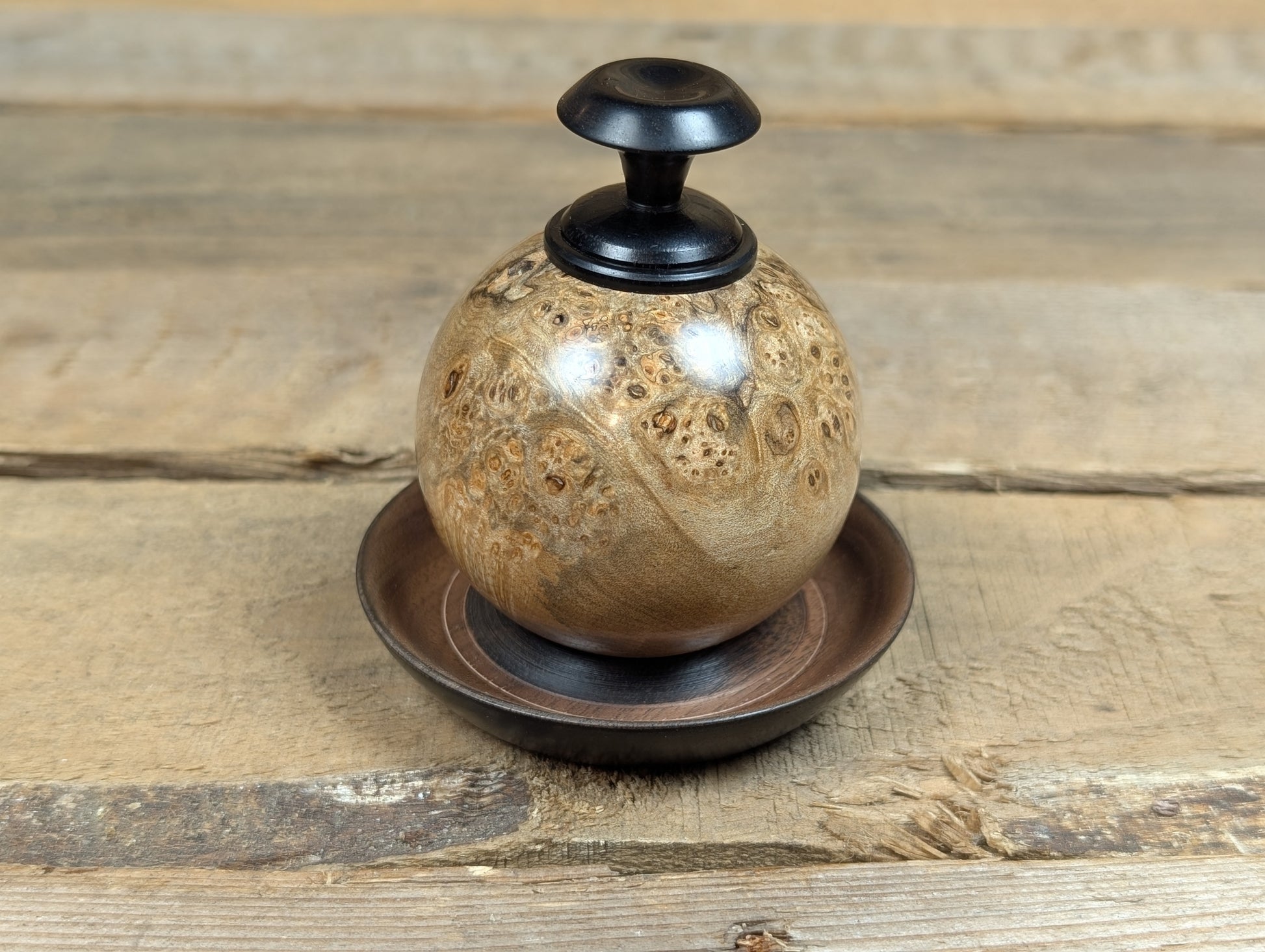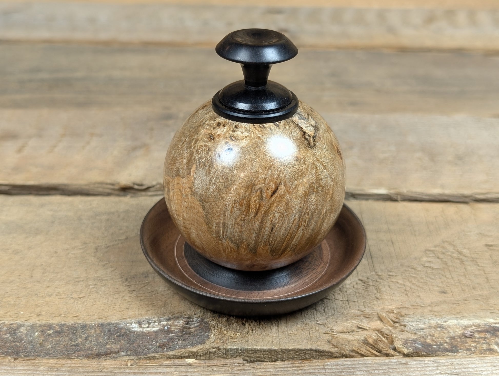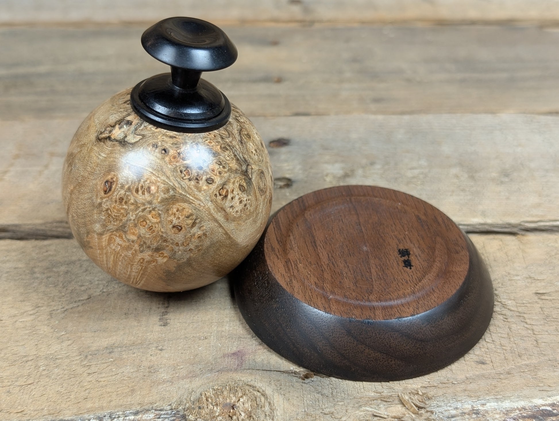 A wee little bauble box turned from gorgeous maple burl, topped with hand chased African blackwood threads and set upon an ebonized black walnut stand. Shiny shellac finish.