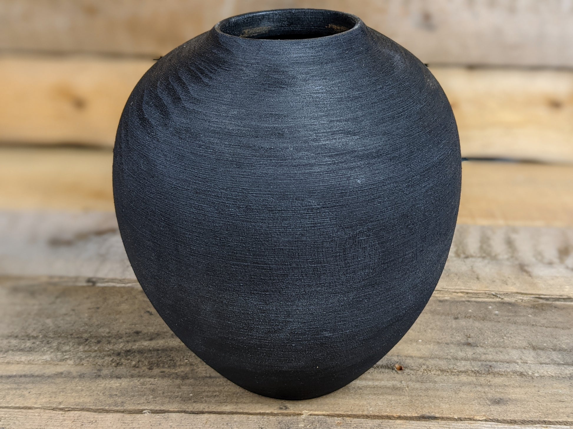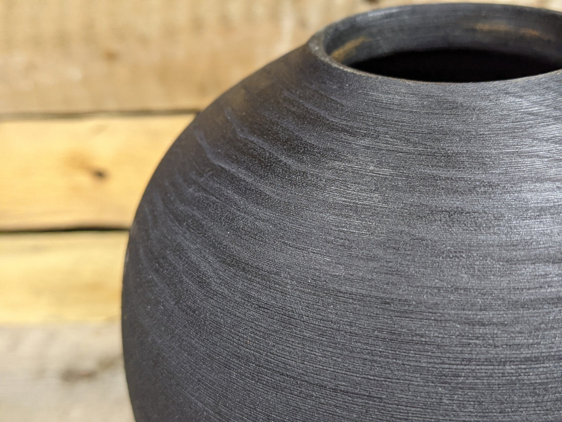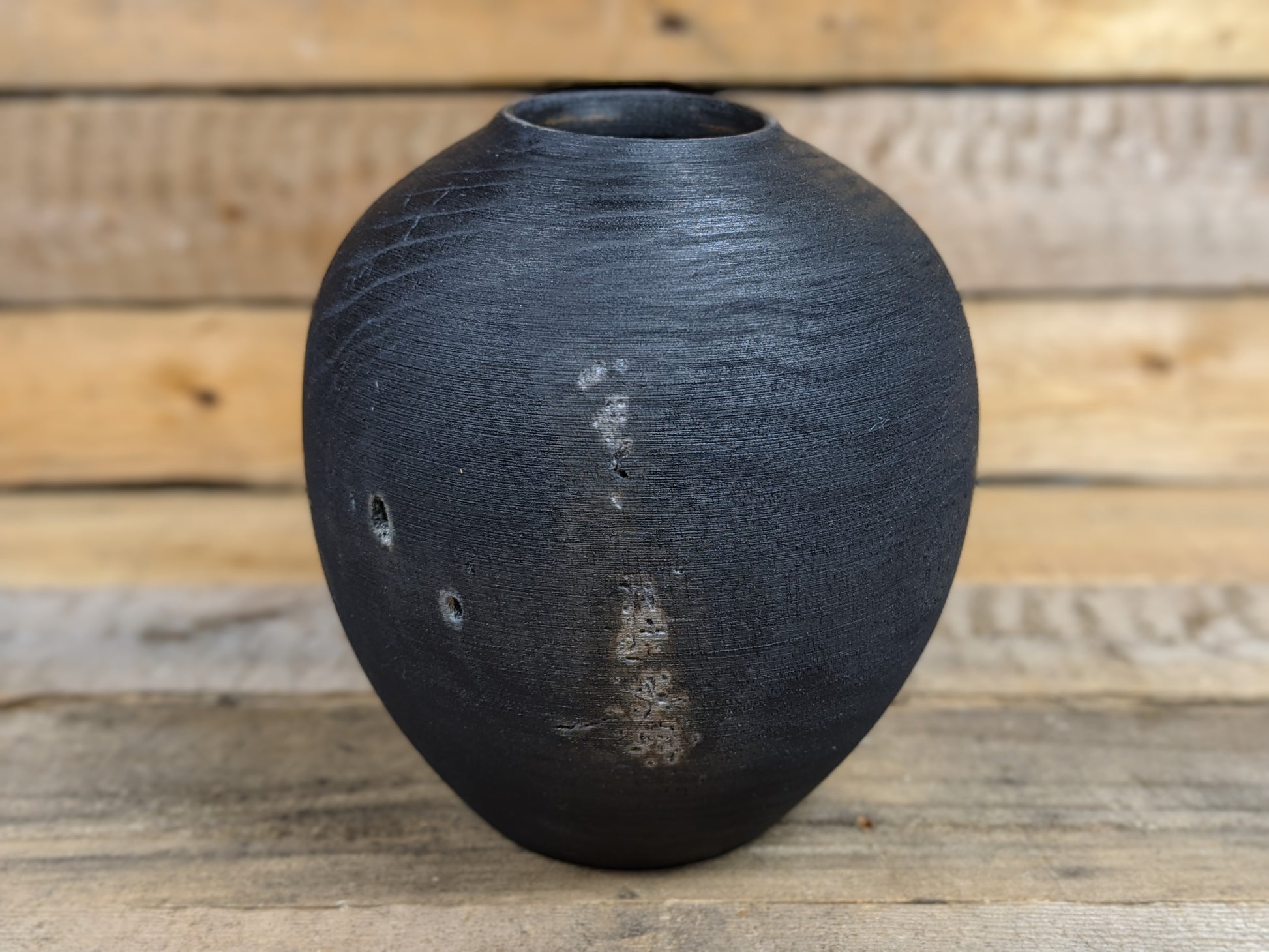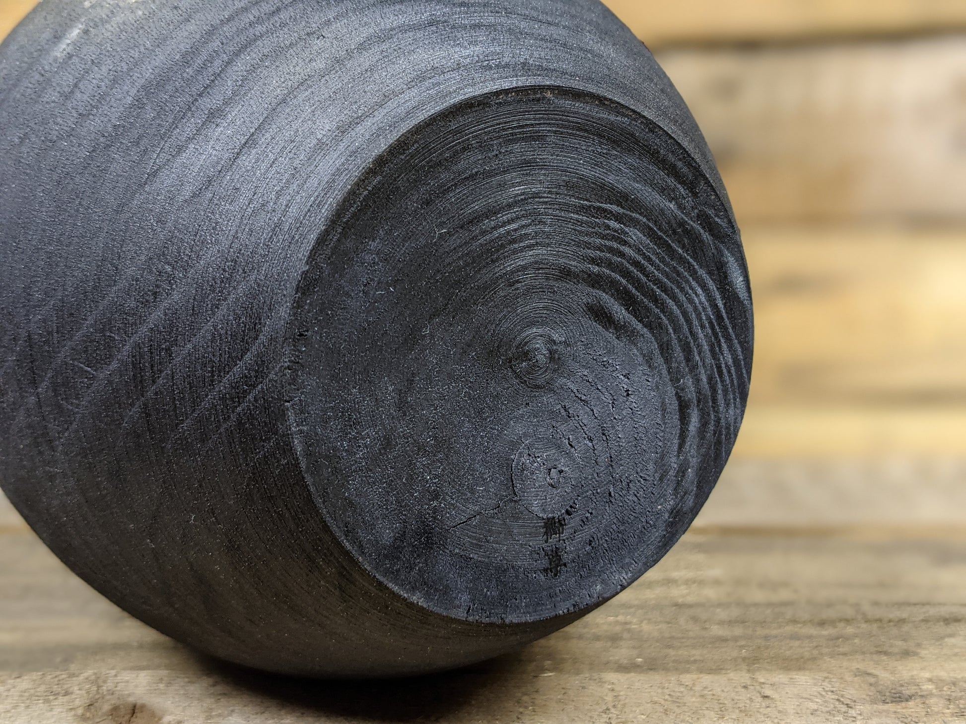 Stunning little ebonized and textured butternut walnut hollow vessel. The ebonizing process had a unique effect on this endangered species of wood especially around some small insect tracks left in the wood. As it dried it took on a slight lilt that seems to point out it's most beautiful face.