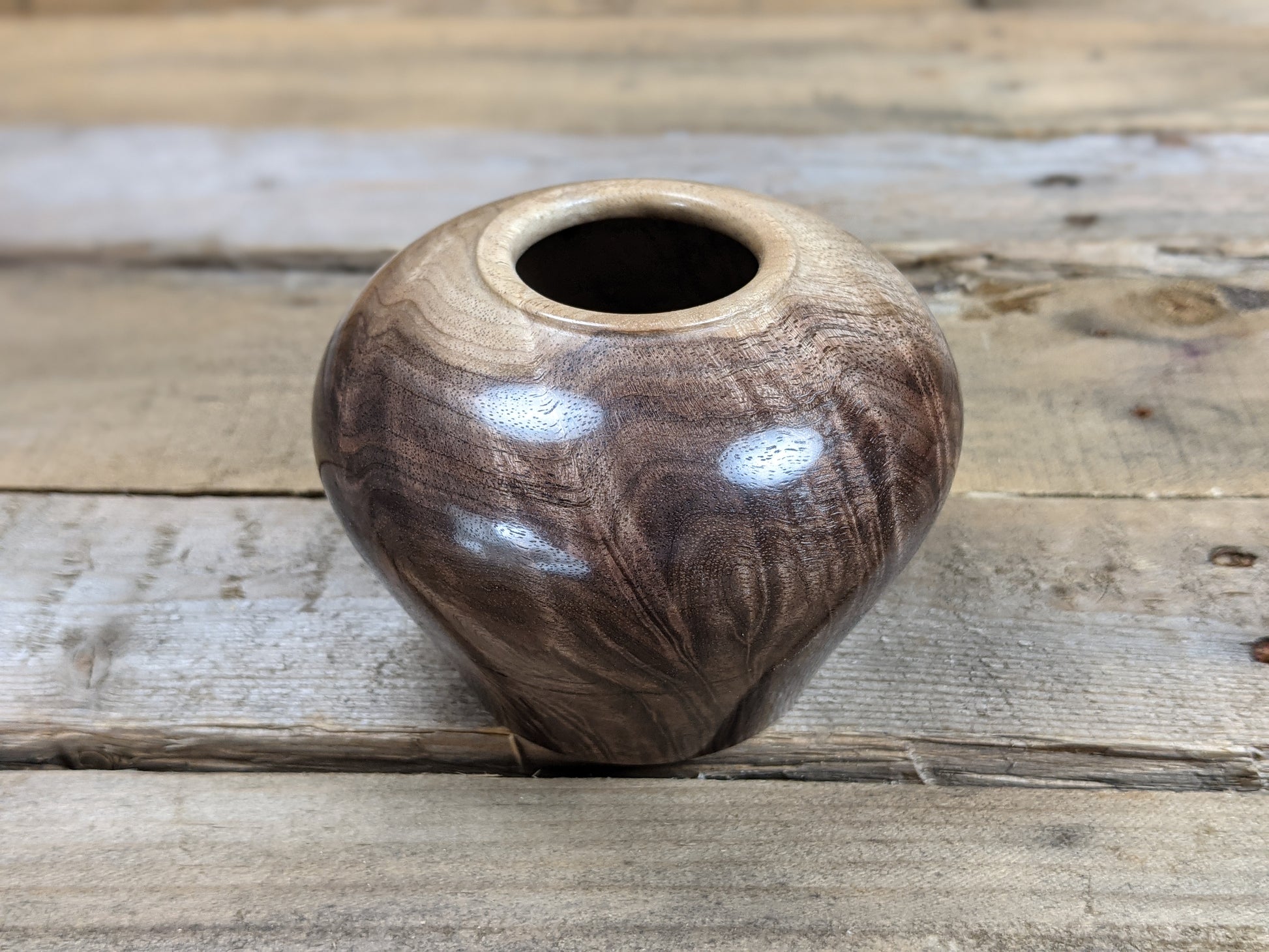 A wee little hollow form turned from some beautiful figured black walnut. Locally sourced and finish with a glossy shellac!