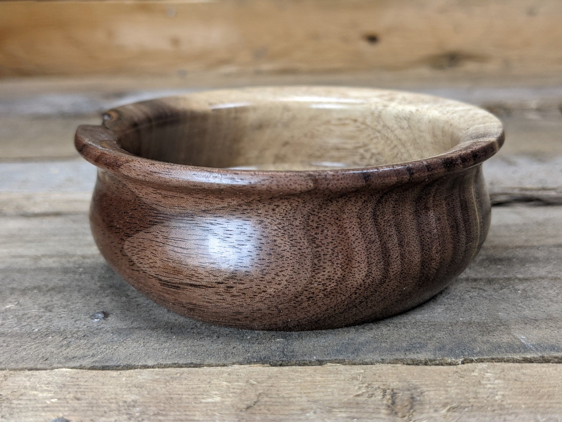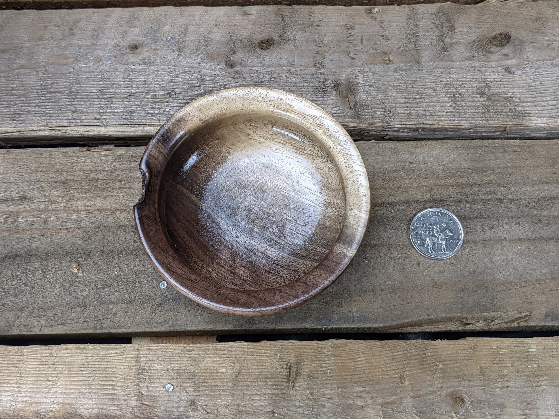 A beautiful black walnut salt throw with a small natural edge from a bark inclusion. Lots of colour this could also serve as a ring or jewelry dish.