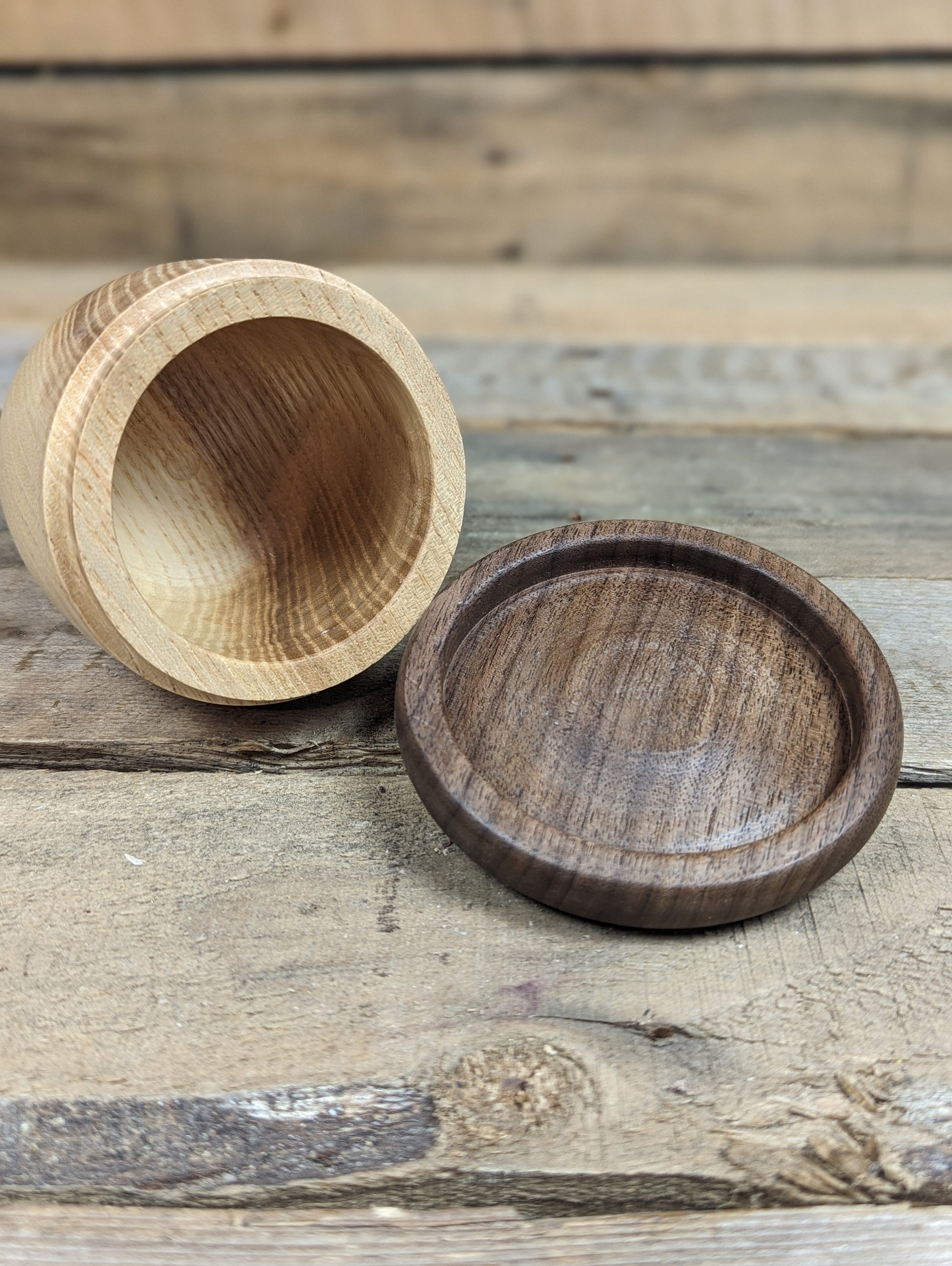 A chonky lil acorn pot made from ash and black walnut. Finished with food safe oil and wax it's a perfect little stash for your knickknacks or little food stuffs.