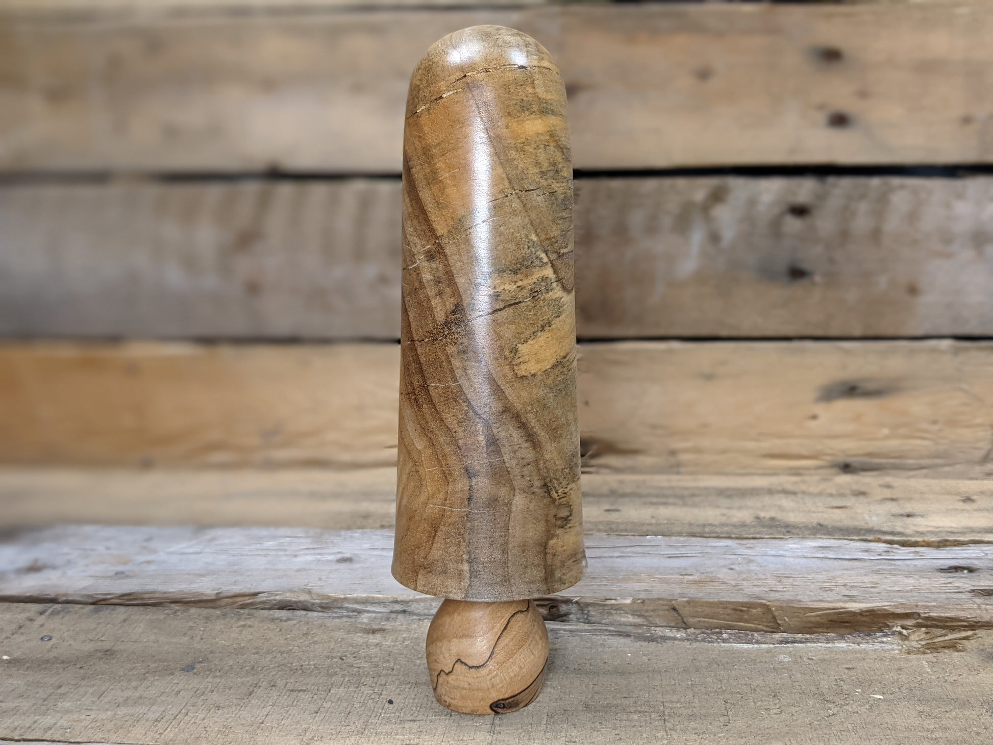 A tall decorative mushroom made from mappa/cottonwood with a sfigured and spalted maple base. Doesn't do anything but looks neat on a shelf or desk.