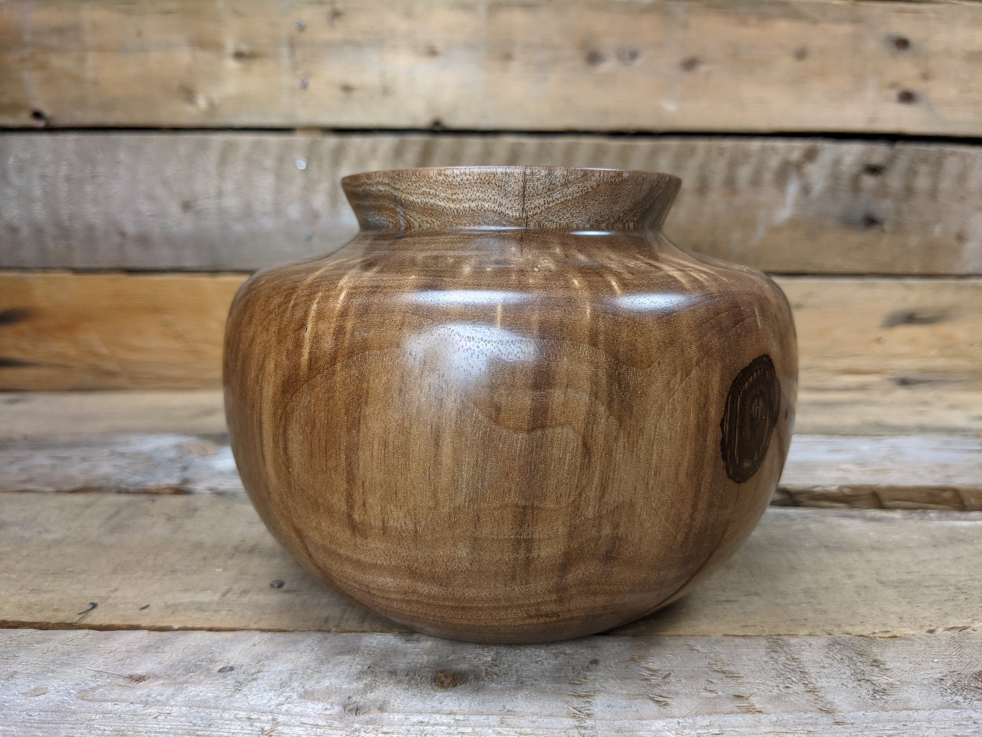 A short and funky end grain pot turned from some local black walnut. A little bit spalted with a few minor cracks(filled with CA) this little guy has plenty of character!! Finished on the outside with shellac, with a food safe oil and wax on the inside this decorative pot could work as a potpourri or just an eye catcher on the bookshelf.
