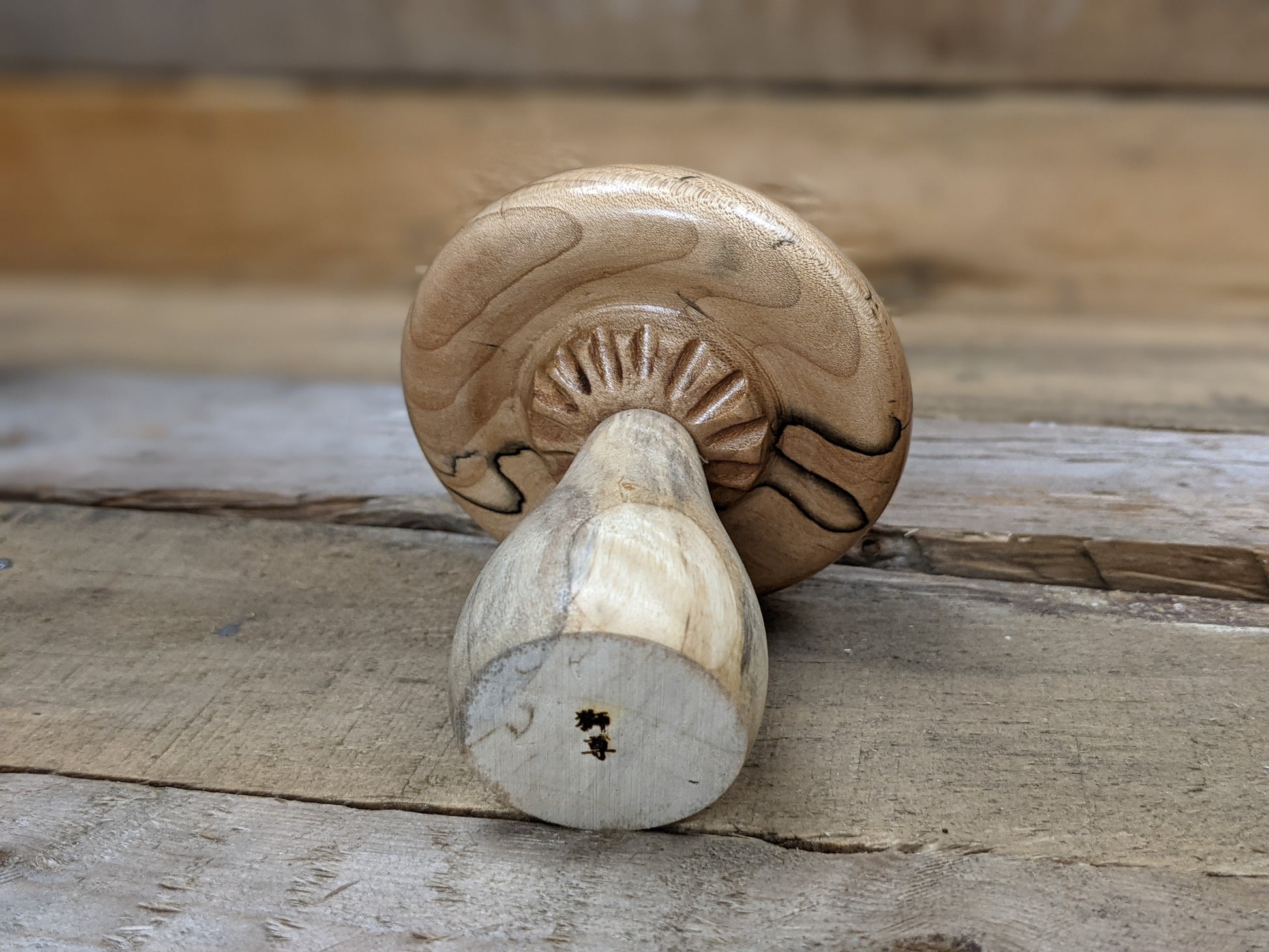 A decorative mushroom made from figured spalted maple and a mappa/cottonwood base.