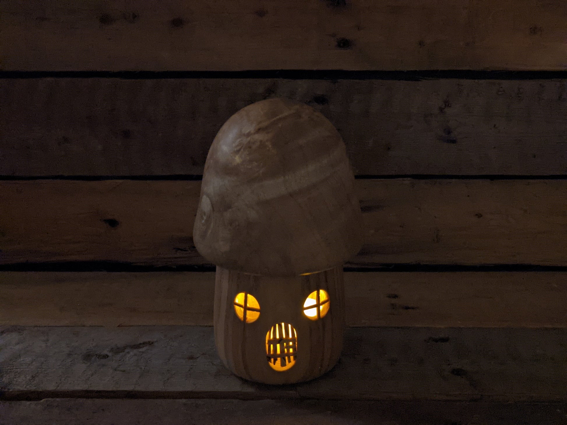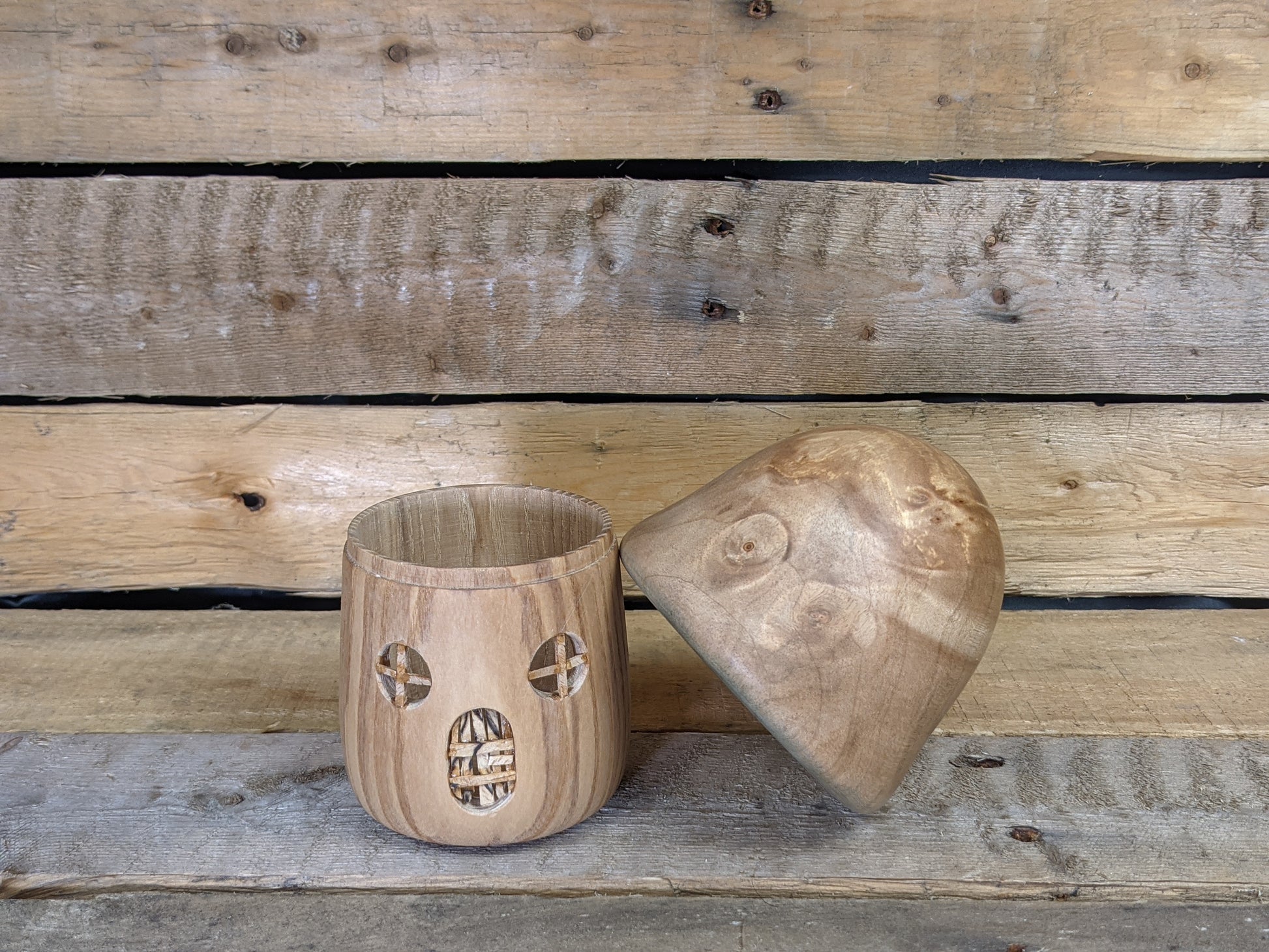 A wee little gnome home made from catalpa and white oak with a spalted beech door and window frames. You can pop the lid off to sneakily store your precious things or toss in an electric tea light for a bit or ambiance.