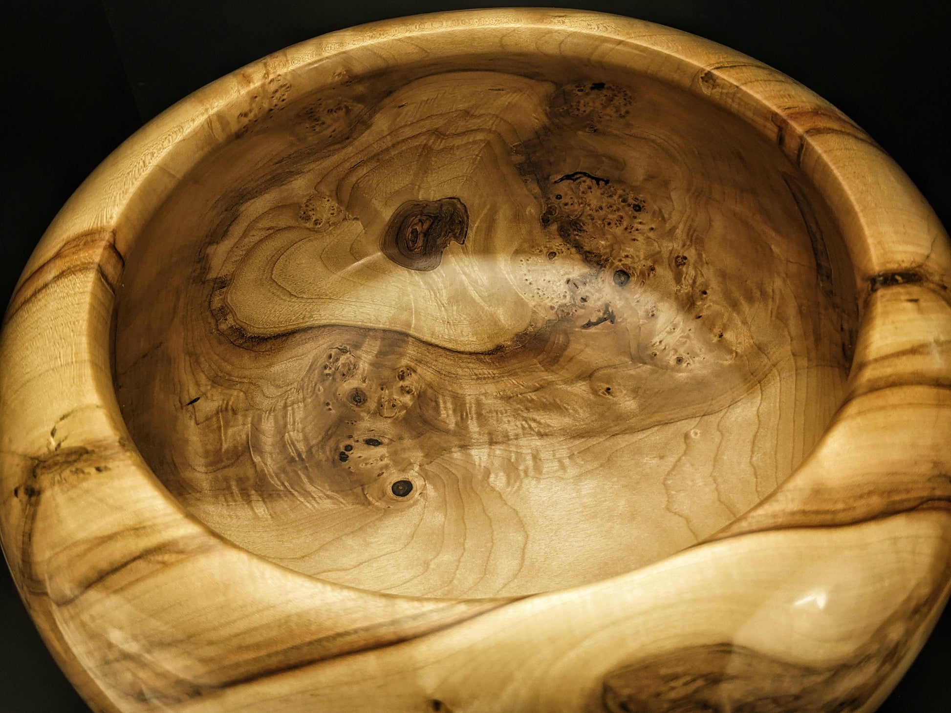 This big beauty was turned from some gorgeously figured crab apple wood. Full of interesting inclusions and little burly bits this thicc and chunky bowl would make an ideal decorative center piece or even a yarn bowl for the floor with its extra weight.