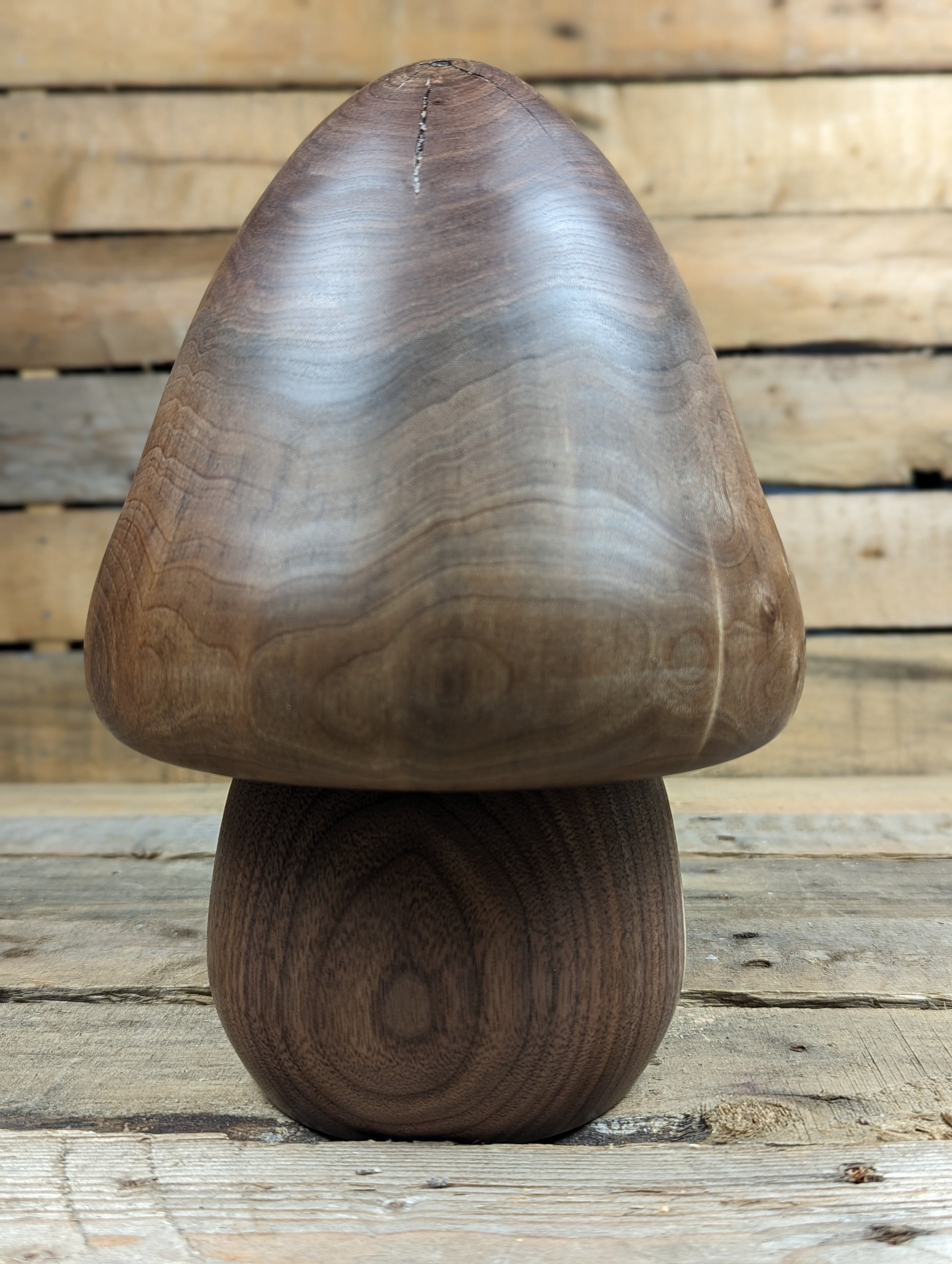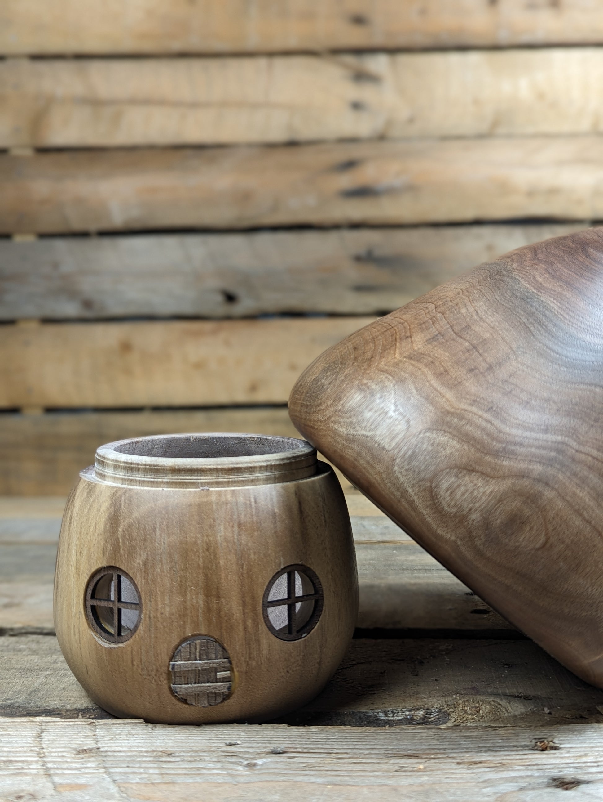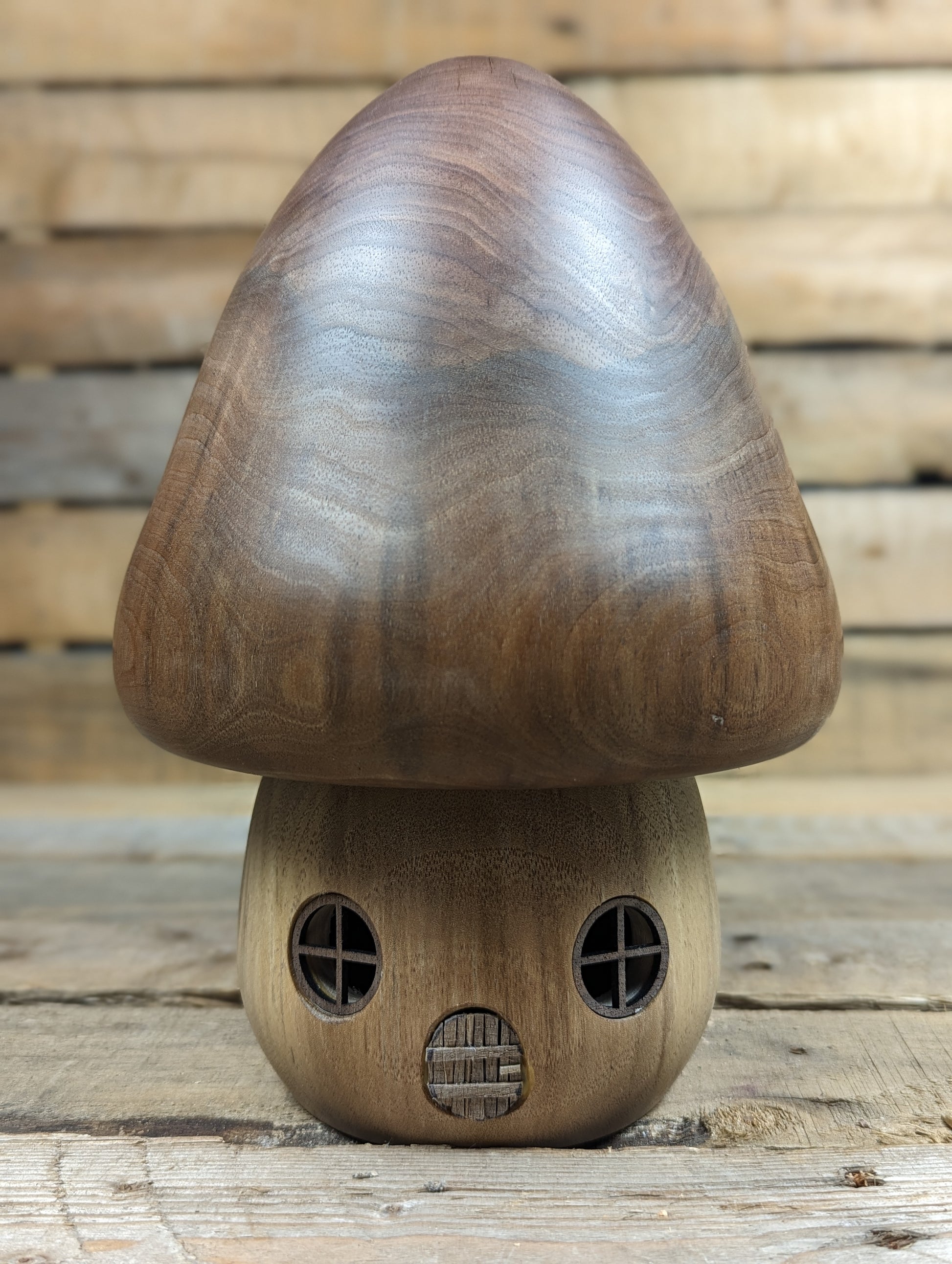 A large gnome home made from all black walnut with a large oversized walnut cap. The cap had a few small cracks that were filled but they don't take away from the piece at all. Featuring laser cut walnut window frames and a hand made walnut door, this little fairy cottage comes with an electric tea light to light add a little night time ambiance!! Use it as a decor piece or stash some of your favorite valuables inside.