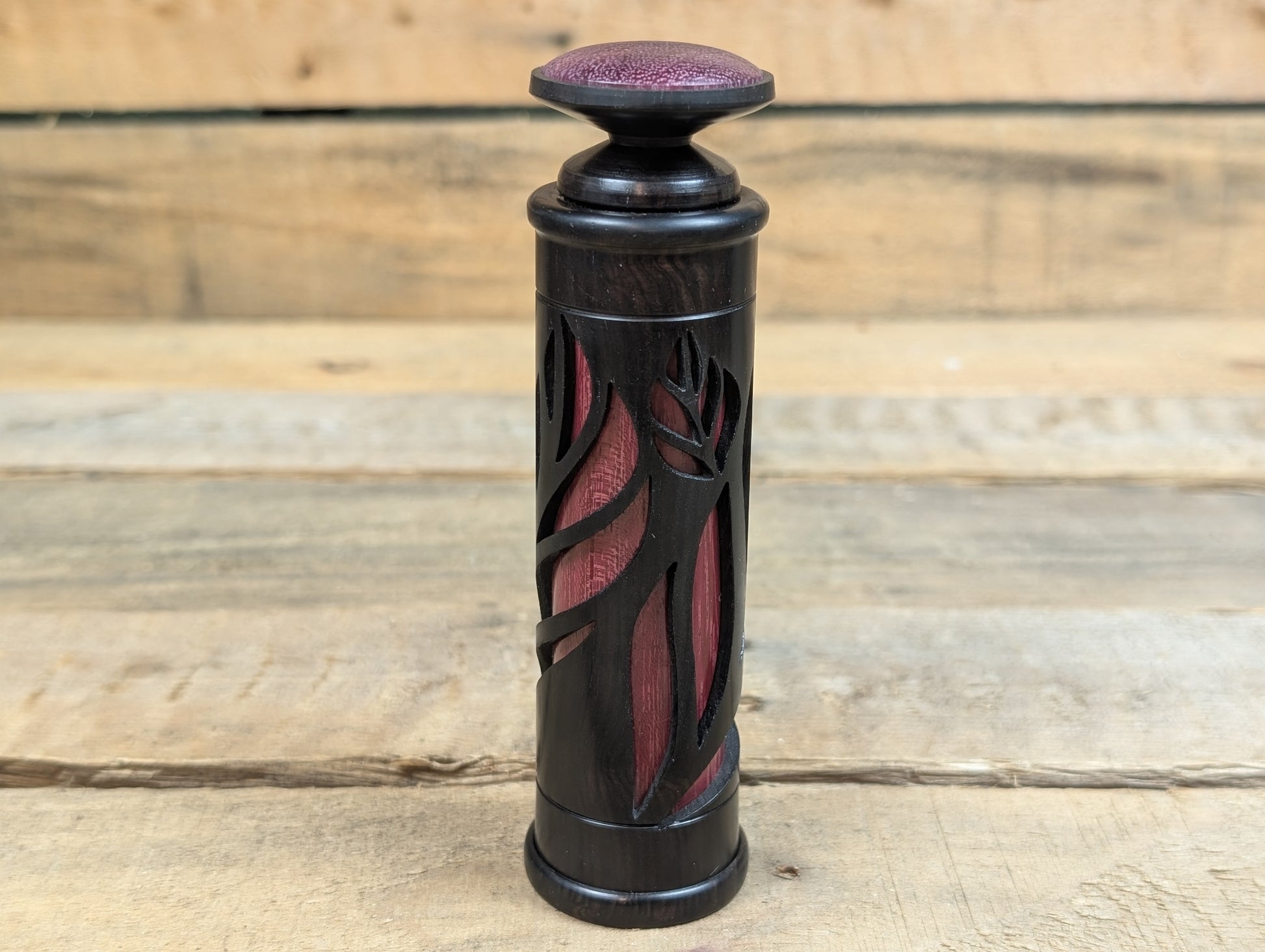 An experimental multilayer laser cut lidded box made from gorgeous African blackwood with a purple heart sleeve inside to help show off the leaf pattern cut into the box. Topped with hand chased African blackwood threads and a purple heart button cap, fill this unusual shaped box with whatever your heart desires.