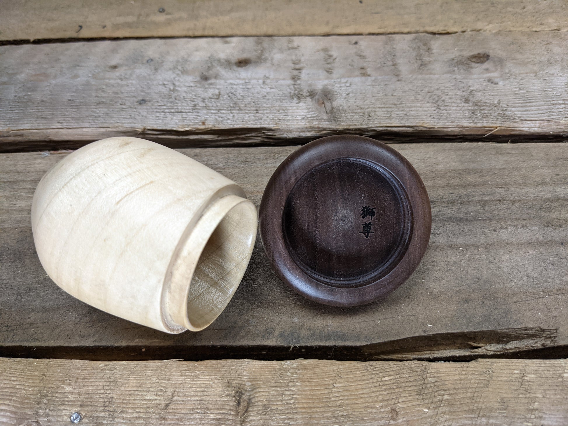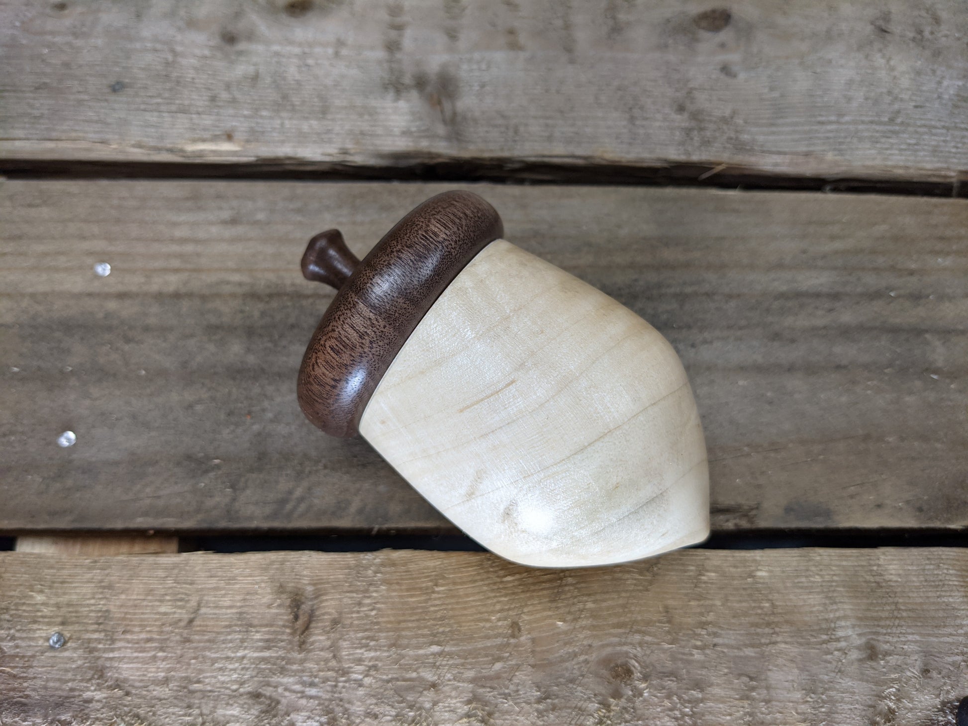 A cute little acorn box made from figured maple with a black walnut cap. Finished with food safe oil and wax it's a great little stash box. The lid has a fairly tight clicky fit that should loosen up over time but will need two thumbs to open it.