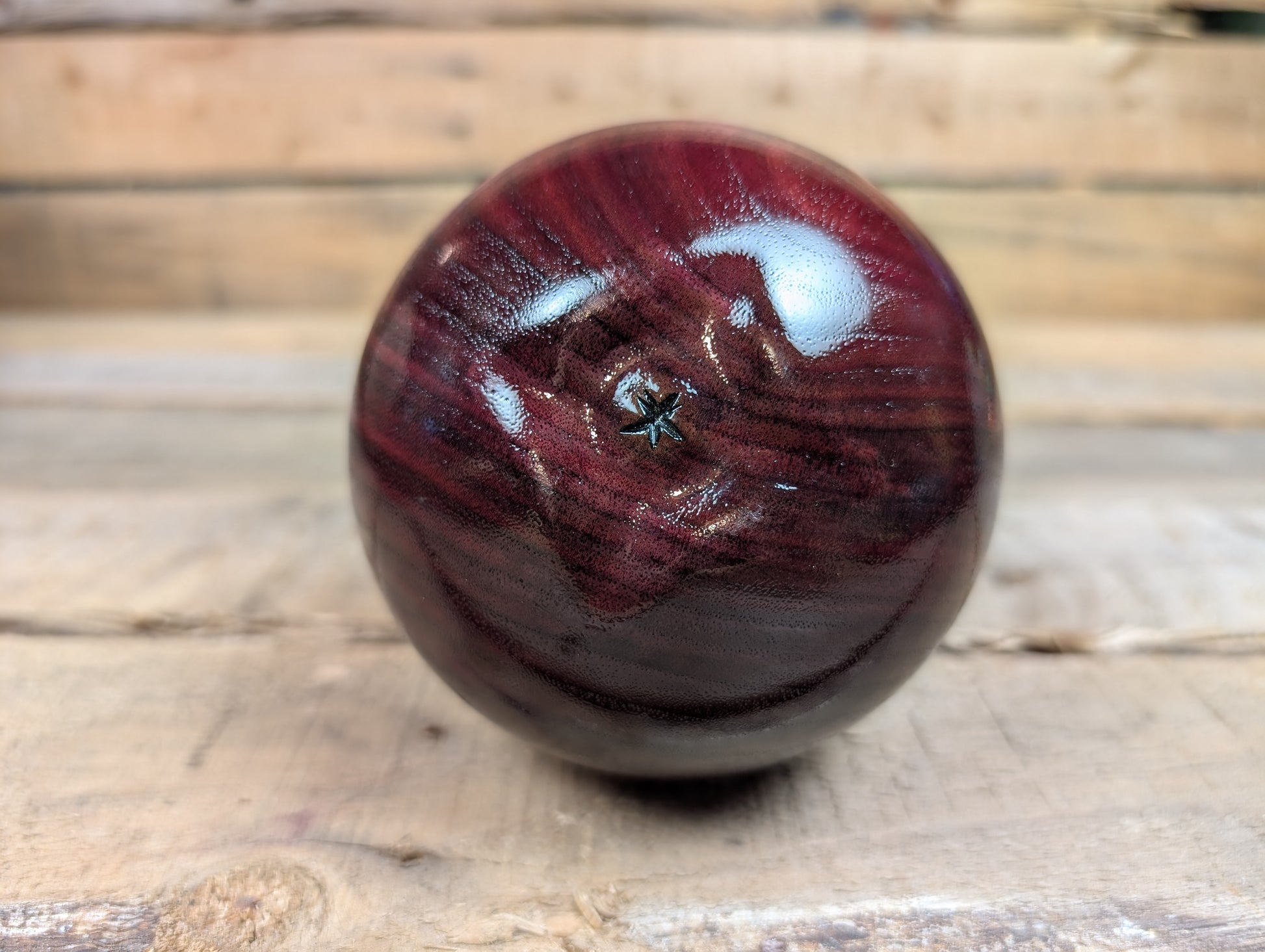 A delicious looking lidded Apple form turned from black walnut and dyed red. Topped with hand chased African blackwood threads and a Lignum vitae leaf this crisp looking apple was finished with lacquer in a way that still shows off the grain of the wood.