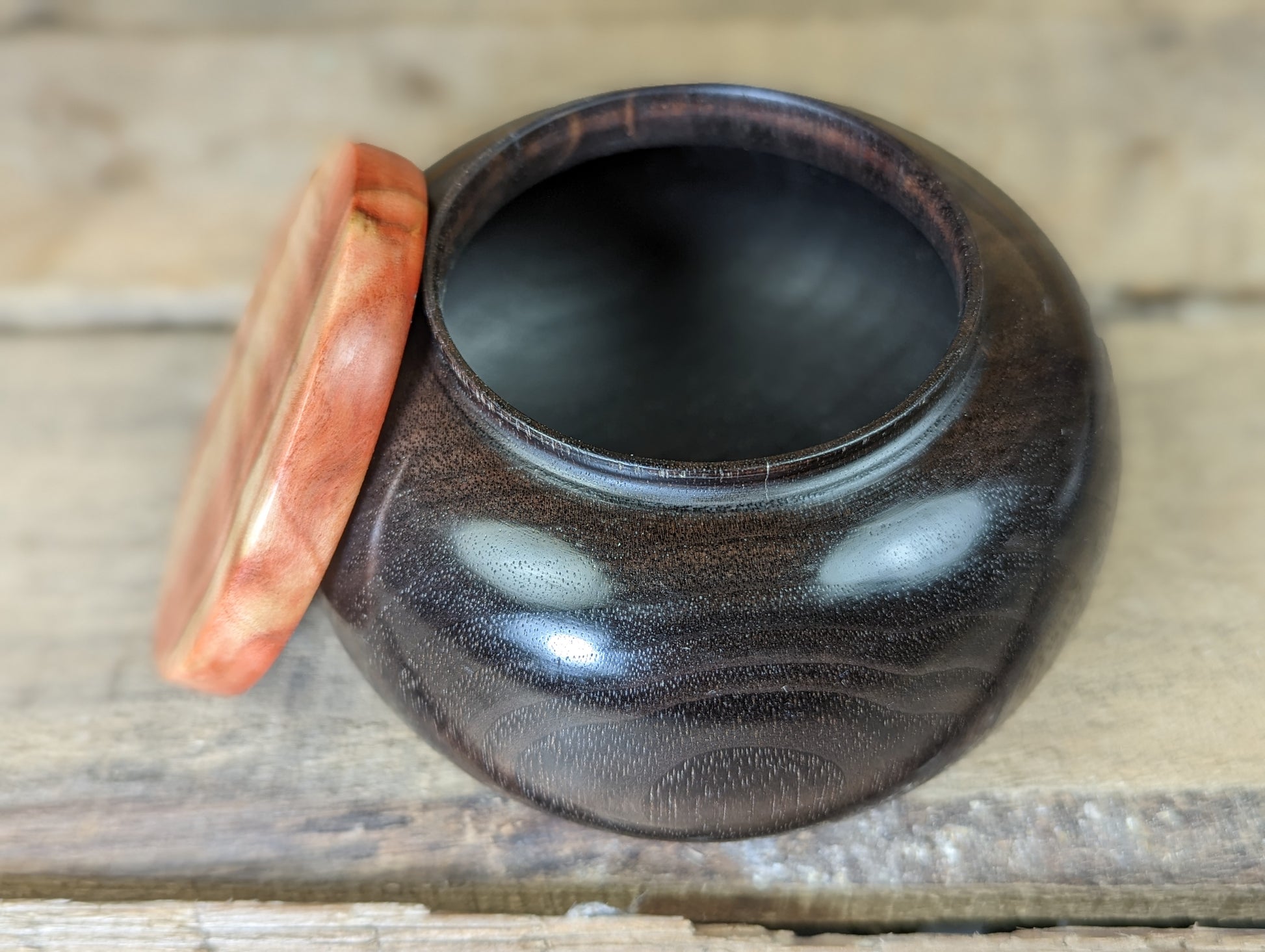 An imitation of a little pickle pot from my childhood. Made from ebonized black walnut with a colourful box elder lid. The inside is finished with a food safe oil and wax on the inside you could use it as a salt throw or just a spot for your little odds and ends.