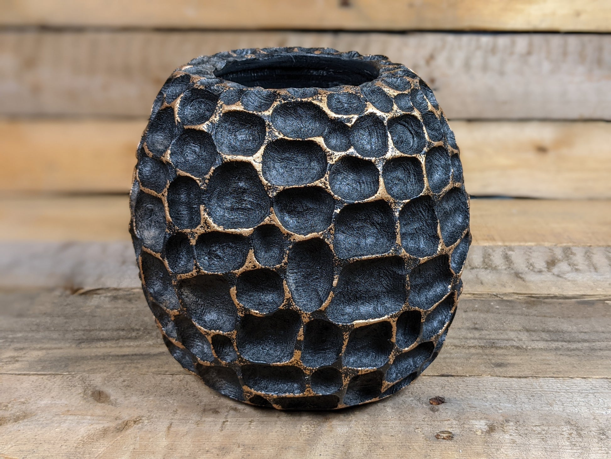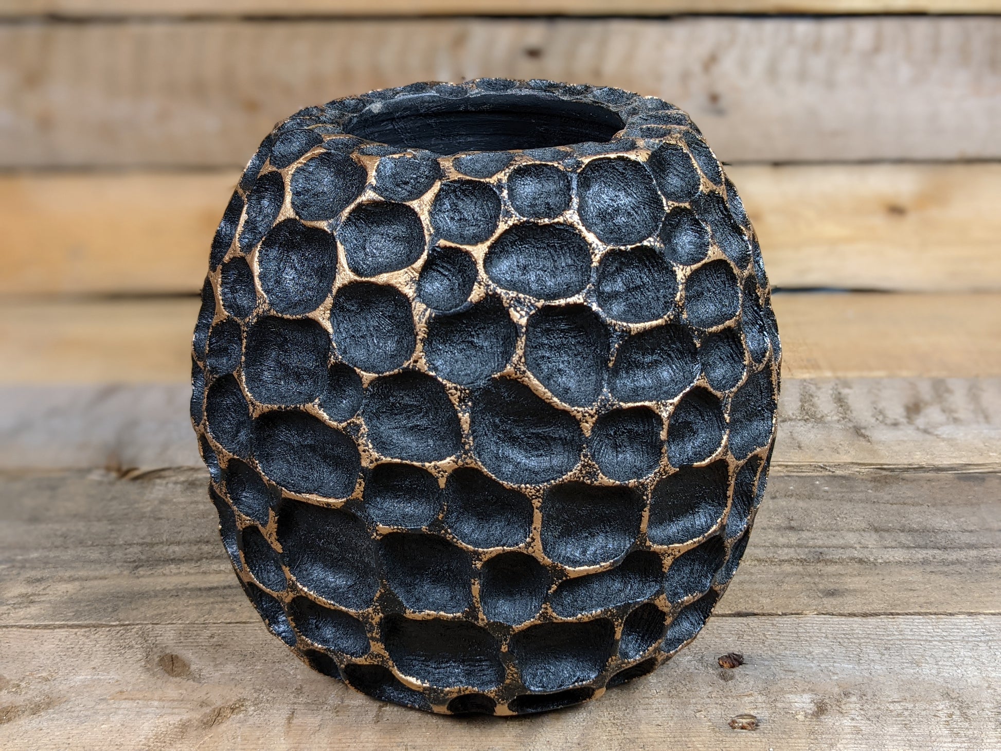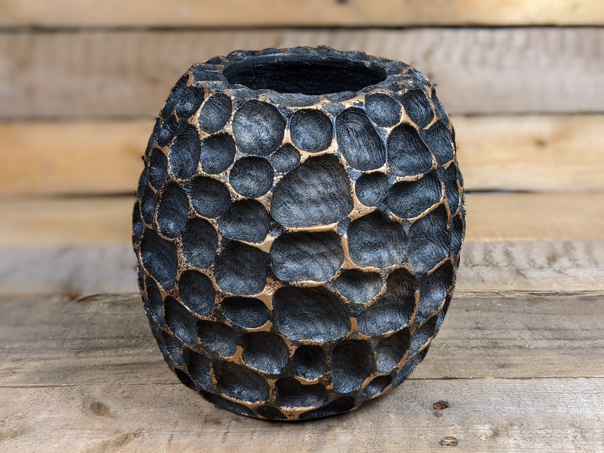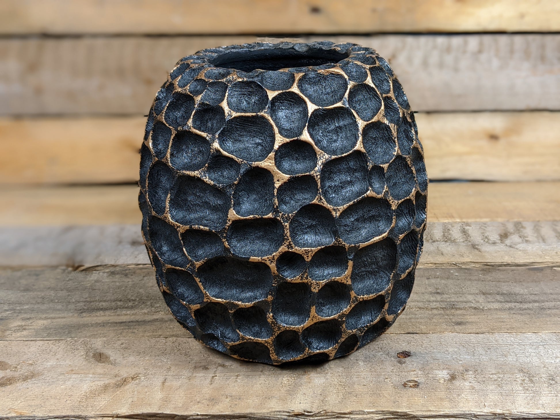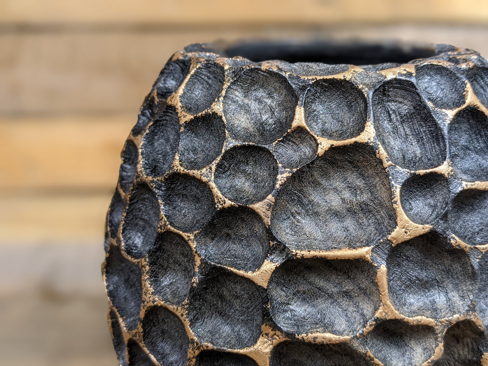 A one of a kind art piece turned from locally salvaged oak, ebonized, deeply textured and painted this unique vessel looks almost out of this world. A very tactile piece that invites you to touch with your eyes and your hands! Turned from green wood it dried somewhat oblong but it only adds to the organic feel of the piece.