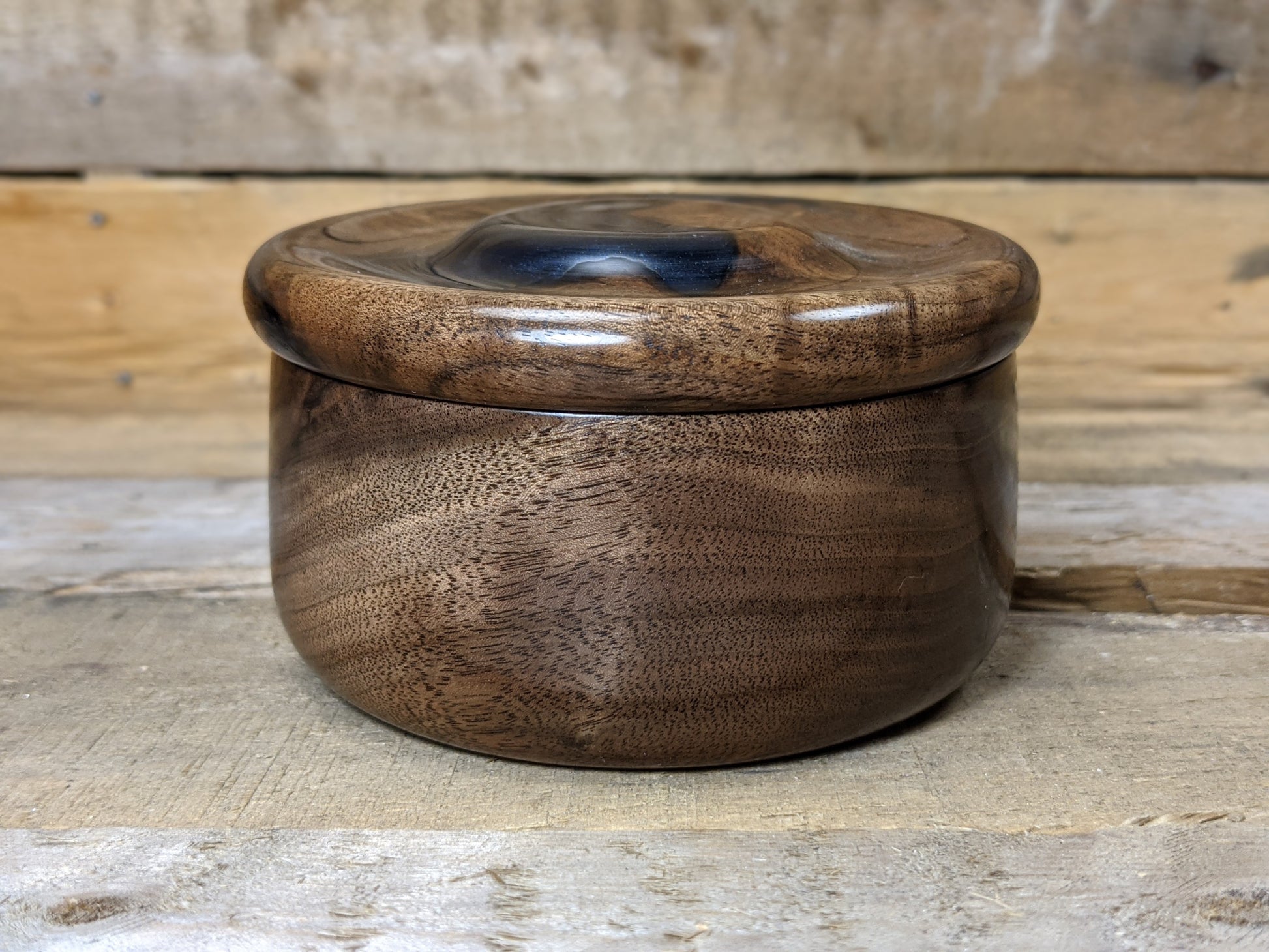 A gorgeous lidded trinket box made from highly figured black walnut and midnight blue resin. A one of a kind box for your one of a kind keepsakes. The lid has firm two handed fit but the rounded rim makes opening it a breeze.