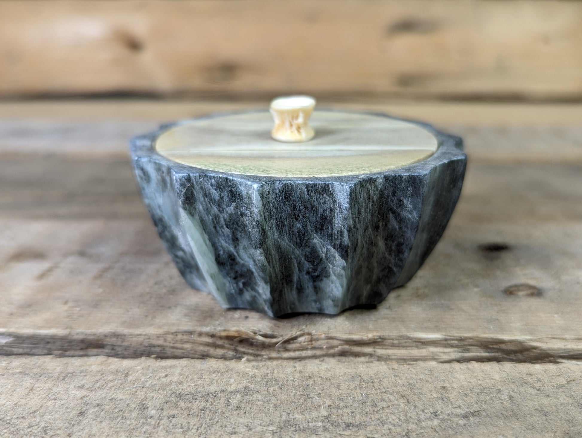 A small box made for a guild challenge. Made from soapstone, laminated elk antler lid and arctic char vertebrae pull. Turned, carved and polished to perfection. Use it for your precious keepsakes or even in the kitchen.
