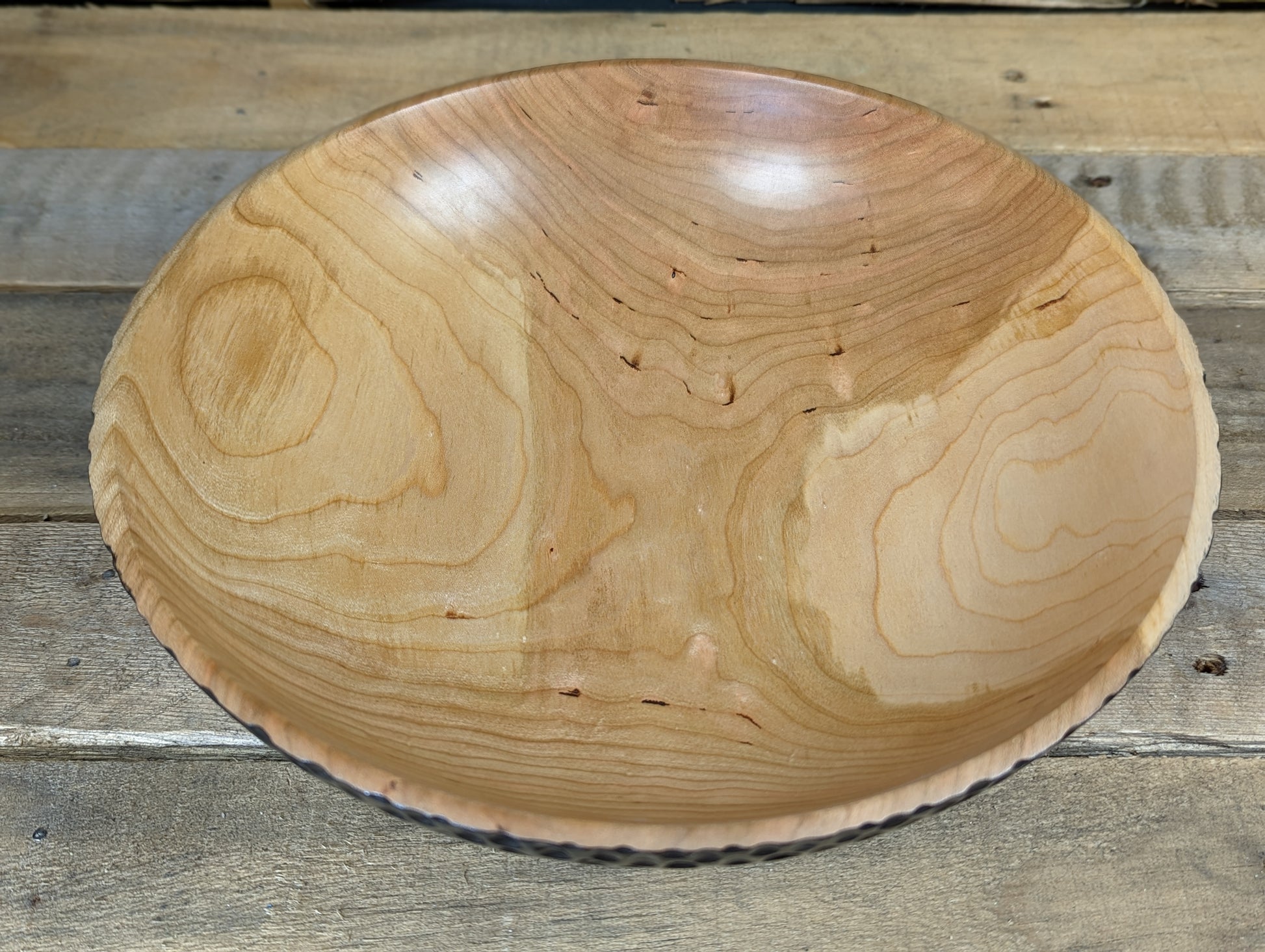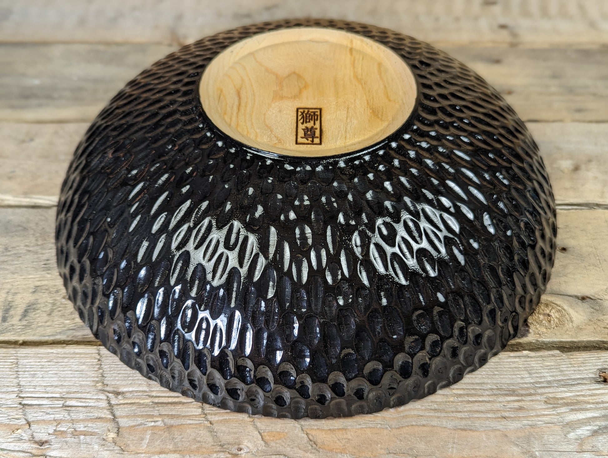A cherry bowl turned for a guild challenge. Turned and textured it's finished with India ink and lacquer on the outside and food safe oil and wax on the inside.
