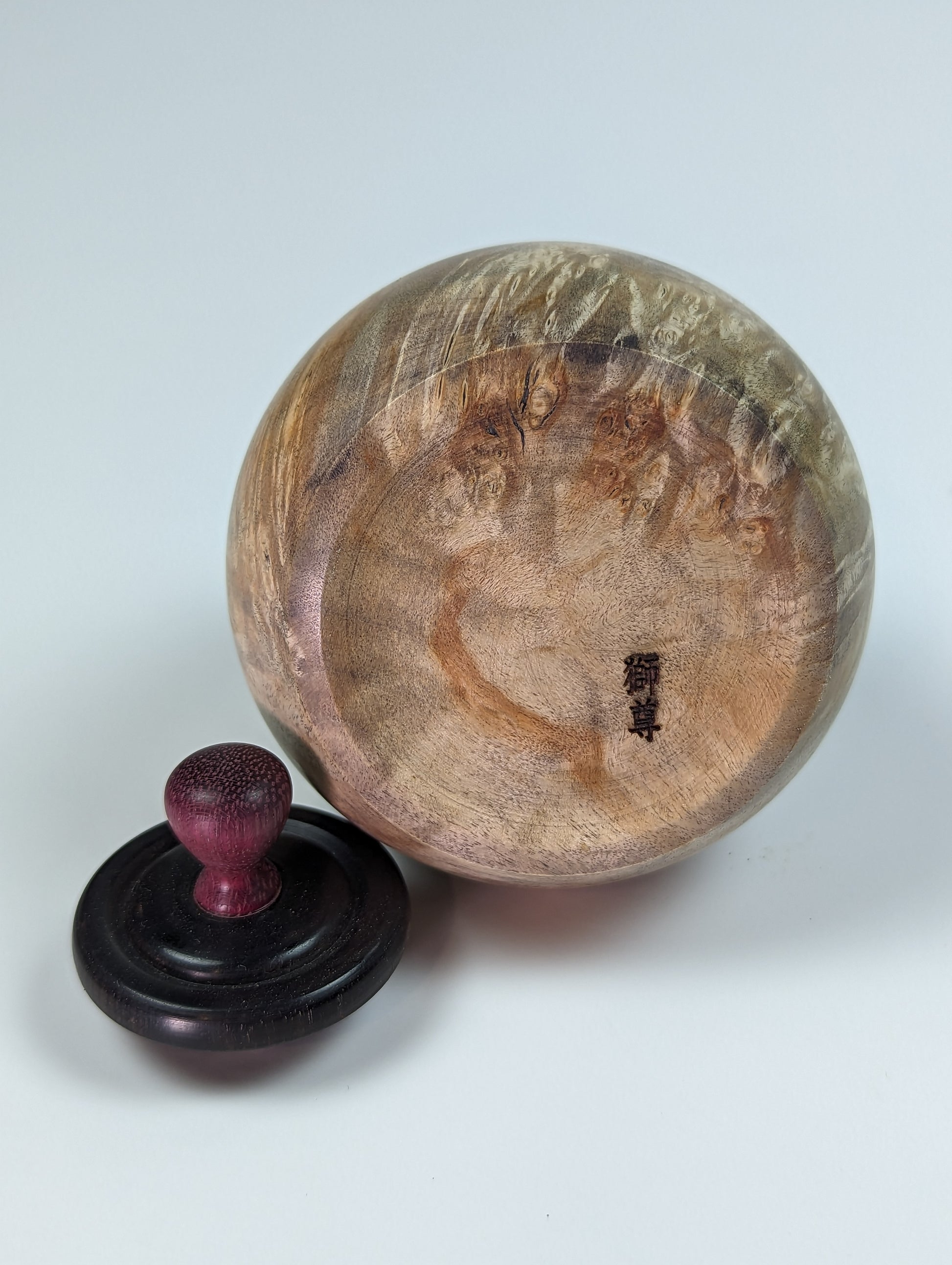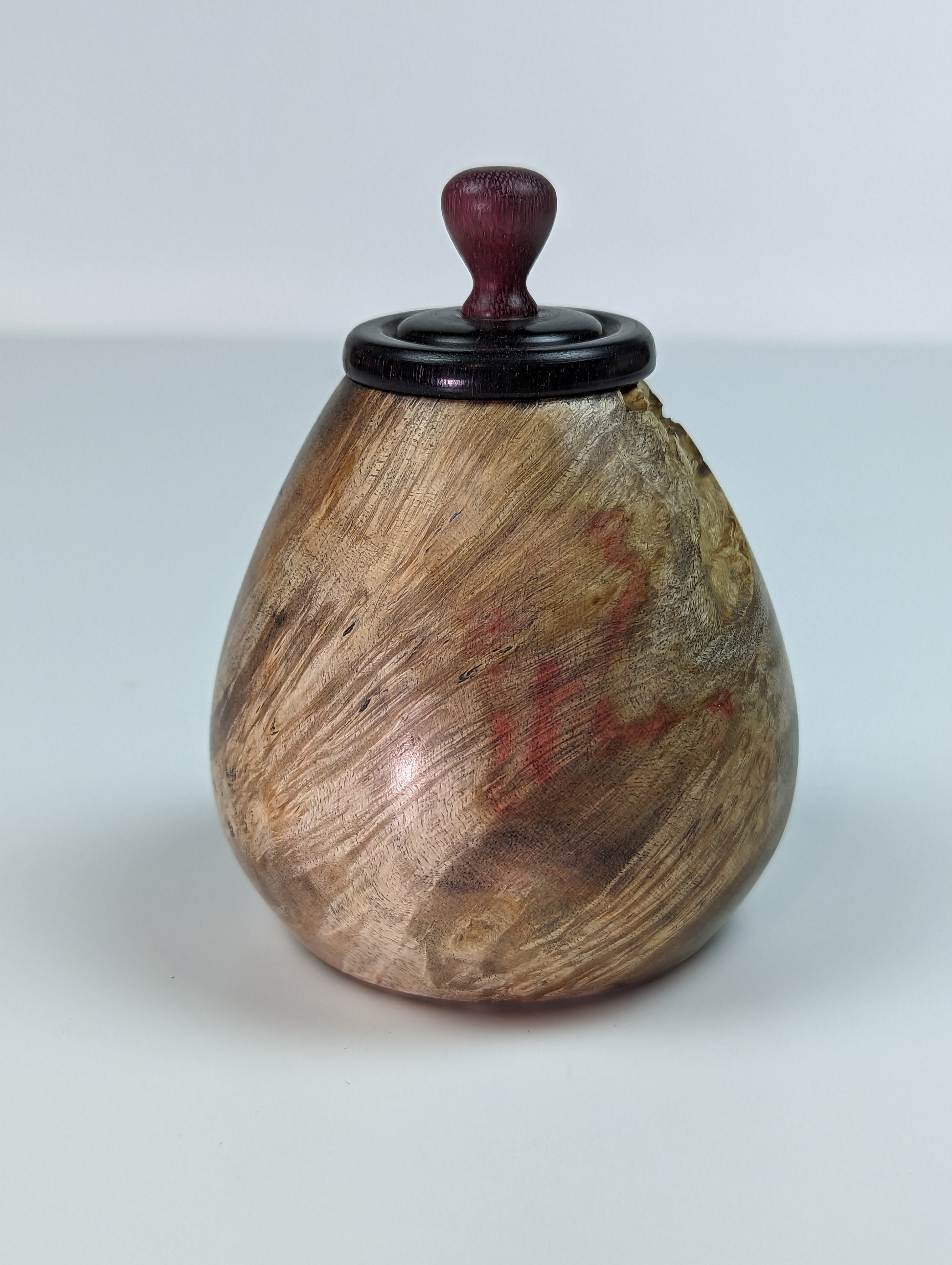 A little lidded pot in the shape of a droplet. Made from beautiful Maple Burl it has both a smooth and spikey texture with some of the burl spikes being left intact. The lid is made with African blackwood with a purple heart pull. This sweet little pot may not be the most practical but it sure is pretty. Finished with food safe oil and wax.